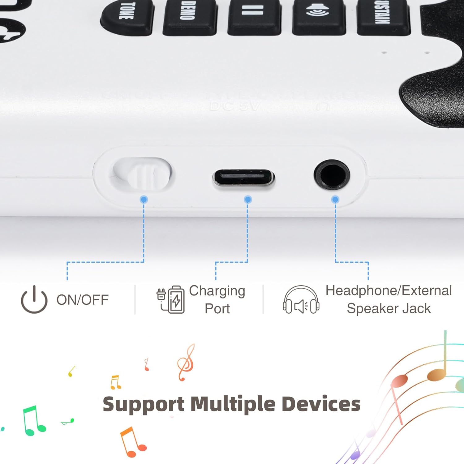 - MULTIFUNCTIONAL --- 8 Unique Tones & 6 Educational Demo Songs & Record Feature & Playback & Echo/Sustain & Built-in Speaker with Volume Control & Audio Output (for Headphones or Speaker) for you to play it out loud or quietly. (Note: No MIDI Function)